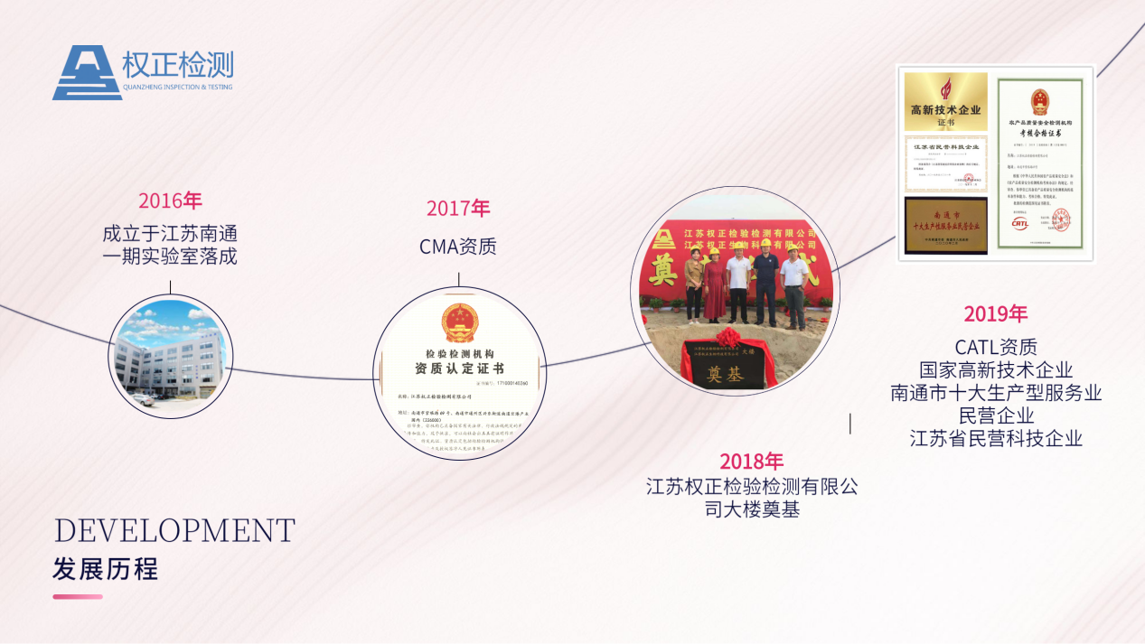2017年4月22日,剛滿周歲的江蘇權(quán)正迎來了江蘇省檢驗(yàn)檢測(cè)機(jī)構(gòu)資質(zhì)認(rèn)定現(xiàn)場(chǎng)評(píng)審,并順利取得CMA資質(zhì)認(rèn)定證書。2018年9月30日,江蘇權(quán)正檢驗(yàn)檢測(cè)有限公司大樓奠基。2018年12月,江蘇權(quán)正再次接受農(nóng)產(chǎn)品質(zhì)量安全檢測(cè)機(jī)構(gòu)考核現(xiàn)場(chǎng)評(píng)審,并于3周歲前獲取了CATL資質(zhì)認(rèn)定證書。一年后,江蘇權(quán)正順利通過國家高新技術(shù)企業(yè)認(rèn)定,被評(píng)為南通市十大生產(chǎn)型服務(wù)業(yè)名營企業(yè)、江蘇省民營科技企業(yè)。